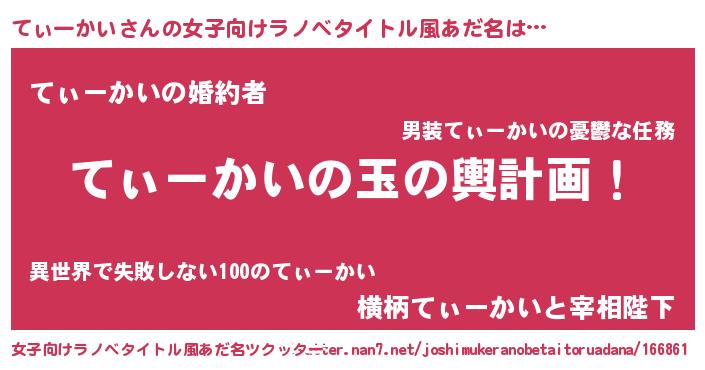 | 男性向けラノベタイトル風あだ名 | 『転生したらてぃーかいだった件』 |