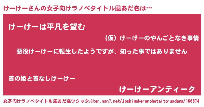 | 男性向けラノベタイトル風あだ名 | 『この素晴らしい世界にけーけーを!』 |