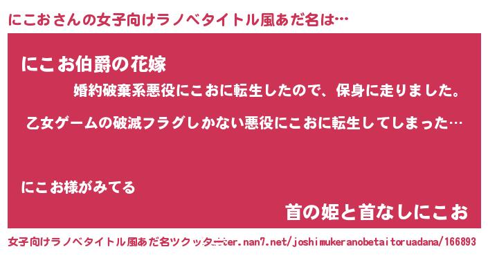 | 男性向けラノベタイトル風あだ名 | 『この素晴らしい世界ににこおを!』 |