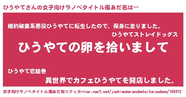 | 男性向けラノベタイトル風あだ名 | 『ダンジョンにひうやてを求めるのは間違っているだろうか』 |
