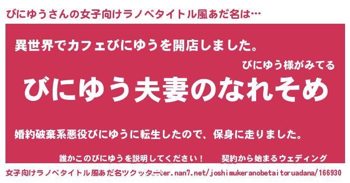 びにゆうさんの女子向けラノベタイトル風あだ名は… 『びにゆう夫妻のなれそめ』『異世界でカフェびにゆうを開店しました。』『誰かこのびにゆうを説明してください! ~契約から始まるウェディング~』 ツクッター #女子向けラノベタイトル風あだ名ツクッター http://tkutter.nan7.net/joshimukeranobetaitoruadana/166930/