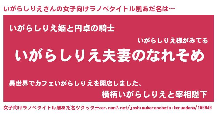 | 男性向けラノベタイトル風あだ名 | 『おまえをオタクにしてやるから、俺をいがらしりえにしてくれ! 』 |