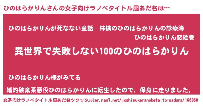 | 男性向けラノベタイトル風あだ名 | 『ひのはらかりんという概念が存在しない退屈な世界 』 |