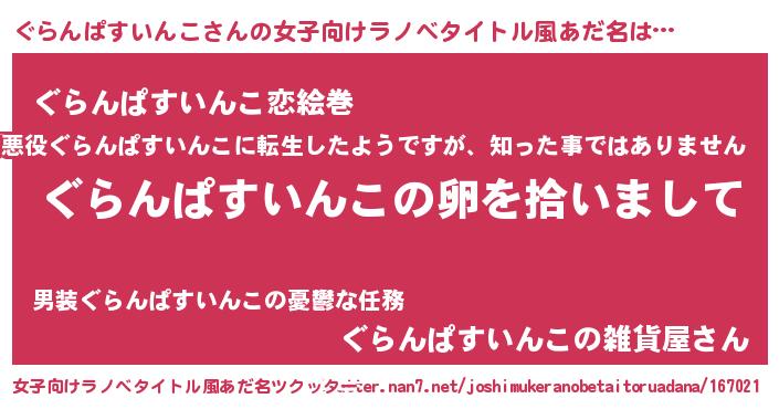 | 男性向けラノベタイトル風あだ名 | 『ダンジョンにぐらんぱすいんこを求めるのは間違っているだろうか』 |