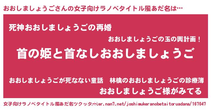 | 男性向けラノベタイトル風あだ名 | 『はたらくおおしましょうごさま!』 |