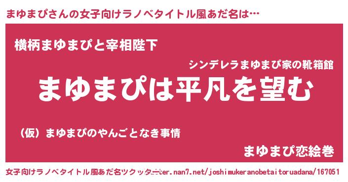 | 男性向けラノベタイトル風あだ名 | 『ダンジョンにまゆまぴを求めるのは間違っているだろうか』 |