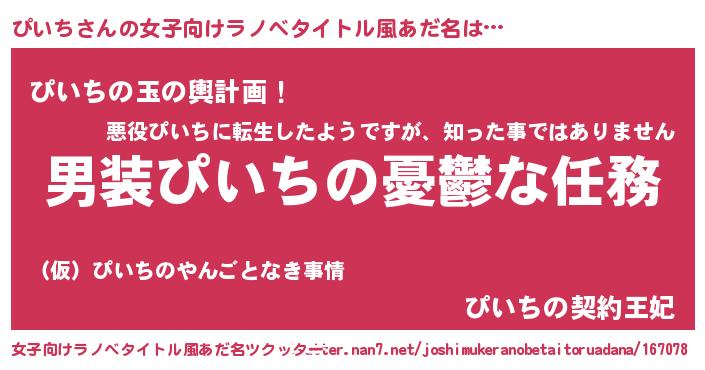 | 男性向けラノベタイトル風あだ名 | 『うちのぴいちが世界を掌握している!』 |