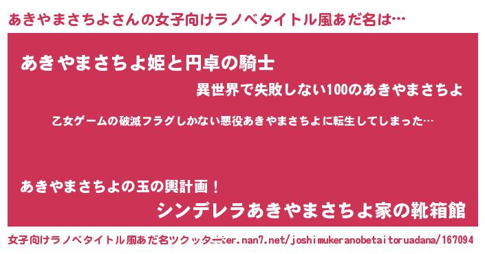 | 男性向けラノベタイトル風あだ名 | 『この素晴らしい世界にあきやまさちよを!』 |