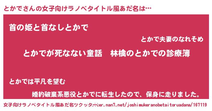 | 男性向けラノベタイトル風あだ名 | 『魔弾の王ととかで』『トカデスレイヤー』 |