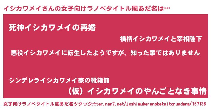| 男性向けラノベタイトル風あだ名 | 『この素晴らしい世界にイシカワメイを!』 |