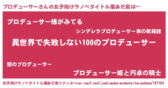 | 男性向けラノベタイトル風あだ名 | 『プロデューサーという概念が存在しない退屈な世界 』 |
