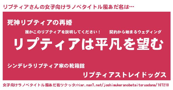 リプティアさんの女子向けラノベタイトル風あだ名は… 『リプティアは平凡を望む』『死神リプティアの再婚』『リプティアストレイドッグス』 ツクッター #女子向けラノベタイトル風あだ名ツクッター http://tkutter.nan7.net/joshimukeranobetaitoruadana/167210/