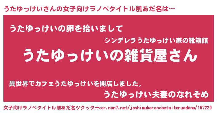 | 男性向けラノベタイトル風あだ名 | 『やはりうたゆっけいの青春ラブコメはまちがっている 』 |