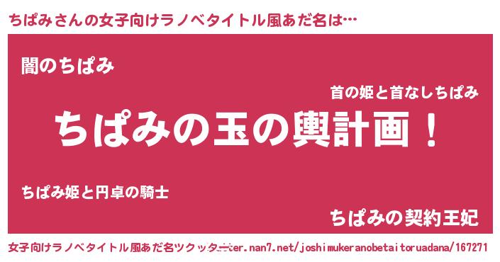 ちぱみさんの女子向けラノベタイトル風あだ名は… 『ちぱみの玉の輿計画!』『闇のちぱみ』『ちぱみの契約王妃』 ツクッター #女子向けラノベタイトル風あだ名ツクッター http://tkutter.nan7.net/joshimukeranobetaitoruadana/167271/