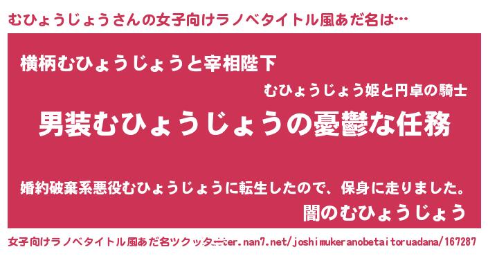 むひょうじょうさんの女子向けラノベタイトル風あだ名は… 『男装むひょうじょうの憂鬱な任務』『横柄むひょうじょうと宰相陛下』『闇のむひょうじょう』 ツクッター #女子向けラノベタイトル風あだ名ツクッター http://tkutter.nan7.net/joshimukeranobetaitoruadana/167287/