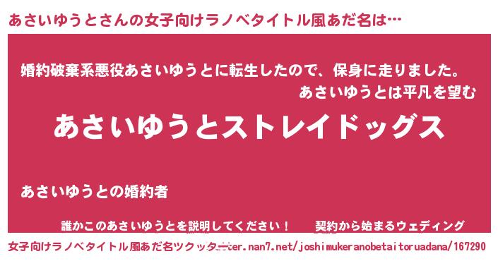 | 男性向けラノベタイトル風あだ名 | 『Re:あさいゆうとから始める異世界生活』 |