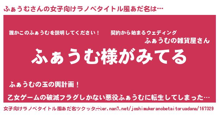 | 男性向けラノベタイトル風あだ名 | 『ふぁうむの嫁は女の子じゃないと思った?』 |
