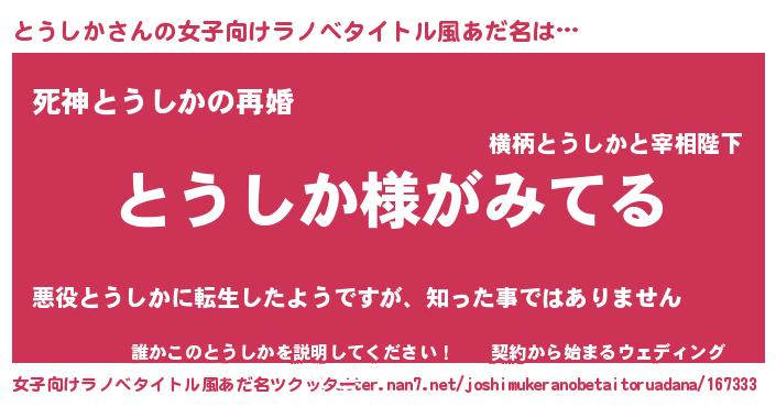 | 男性向けラノベタイトル風あだ名 | 『とうしかの嫁は女の子じゃないと思った?』 |