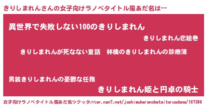 | 男性向けラノベタイトル風あだ名 | 『魔弾の王ときりしまれん』 |