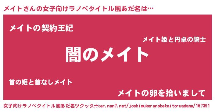 | 男性向けラノベタイトル風あだ名 | 『Re:メイトから始める異世界生活』 |