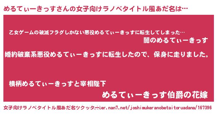 | 男性向けラノベタイトル風あだ名 | 『メルティーキッススレイヤー』 |