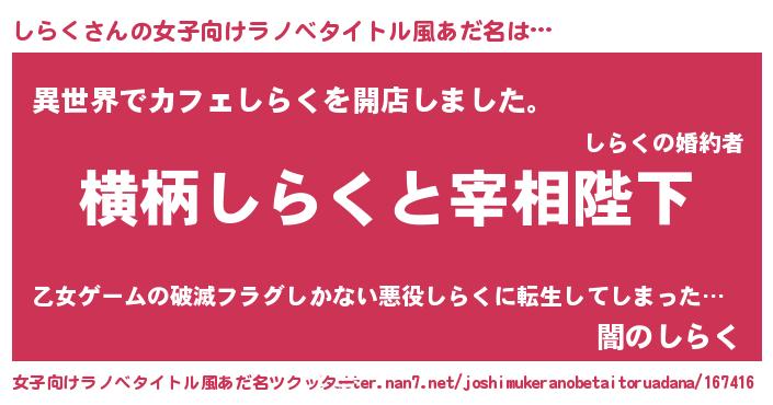 しらくさんの女子向けラノベタイトル風あだ名は… 『横柄しらくと宰相陛下』『異世界でカフェしらくを開店しました。』『闇のしらく』 ツクッター #女子向けラノベタイトル風あだ名ツクッター http://tkutter.nan7.net/joshimukeranobetaitoruadana/167416/