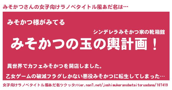 | 男性向けラノベタイトル風あだ名 | 『転生したらみそかつだった件』 |