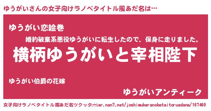 | 男性向けラノベタイトル風あだ名 | 『ゆうがいに滅ぼされるだけの簡単なお仕事です』 |