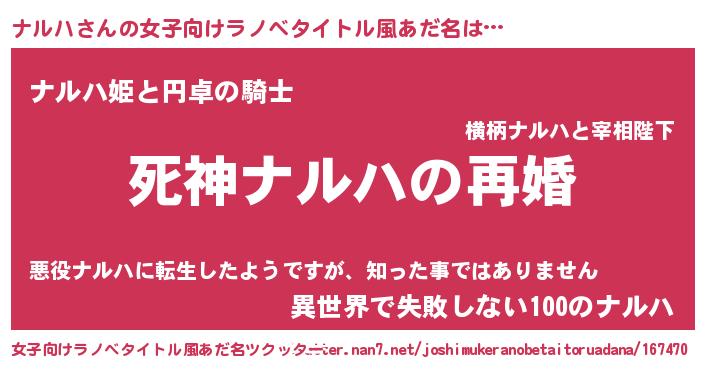 | 男性向けラノベタイトル風あだ名 | 『ノーゲーム・ノーナルハ』 |