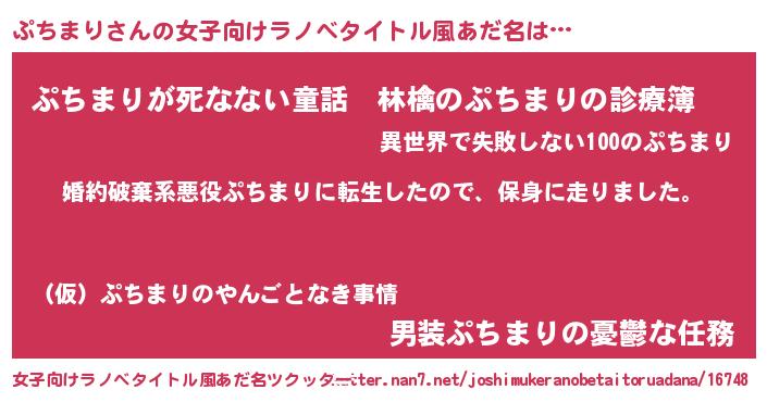 | 男性向けラノベタイトル風あだ名 | 『プチマリスレイヤー』『ぷちまりの憂鬱』 |