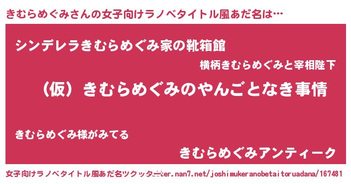 きむらめぐみさんの女子向けラノベタイトル風あだ名は… 『(仮)きむらめぐみのやんごとなき事情』『シンデレラきむらめぐみ家の靴箱館』『きむらめぐみアンティーク』 ツクッター #女子向けラノベタイトル風あだ名ツクッター http://tkutter.nan7.net/joshimukeranobetaitoruadana/167481/