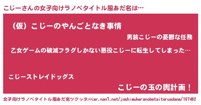 | 男性向けラノベタイトル風あだ名 | 『この素晴らしい世界にこじーを!』 |