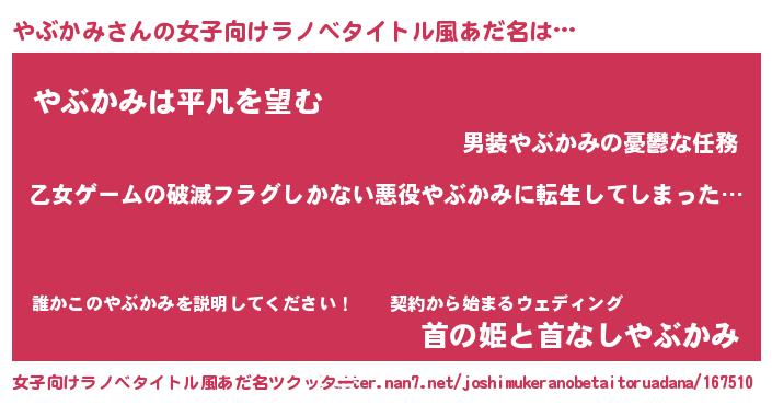 | 男性向けラノベタイトル風あだ名 | 『この素晴らしい世界にやぶかみを!』 |