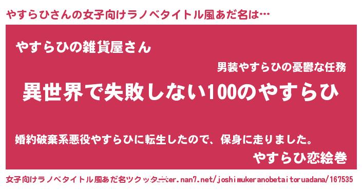 | 男性向けラノベタイトル風あだ名 | 『やすらひという概念が存在しない退屈な世界 』 |