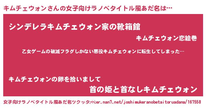 | 男性向けラノベタイトル風あだ名 | 『魔弾の王とキムチェウォン』 |