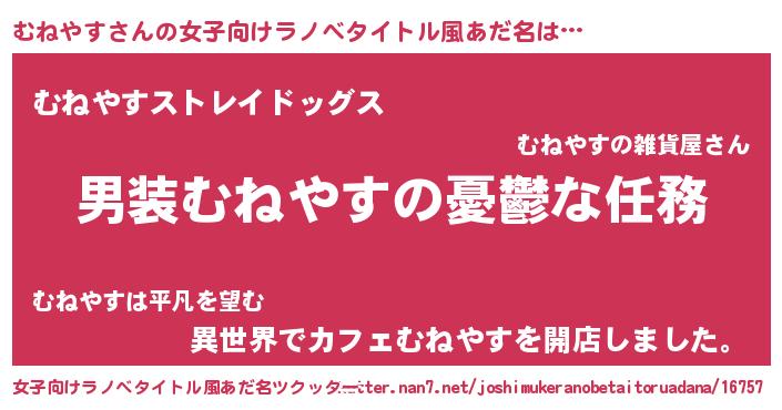 | 男性向けラノベタイトル風あだ名 | 『うちのむねやすが世界を掌握している!』 |