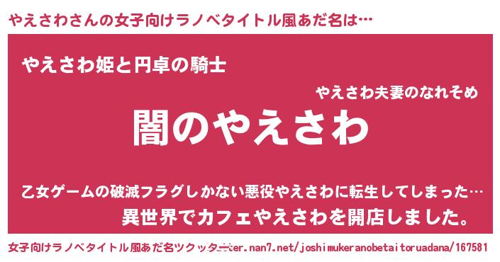 | 男性向けラノベタイトル風あだ名 | 『Re:やえさわから始める異世界生活』 |