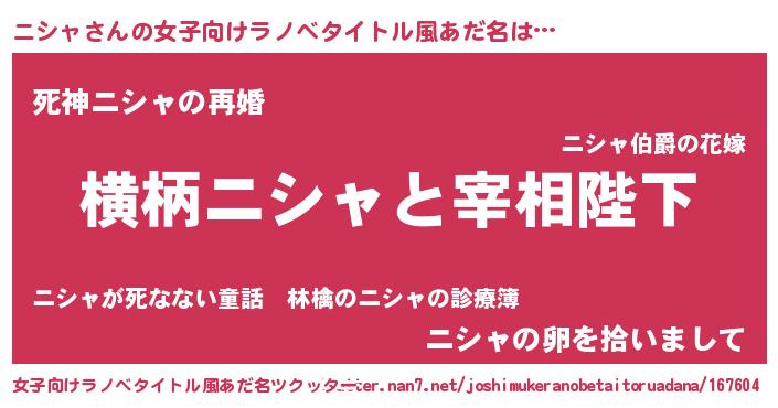 | 男性向けラノベタイトル風あだ名 | 『ニシャに滅ぼされるだけの簡単なお仕事です』 |