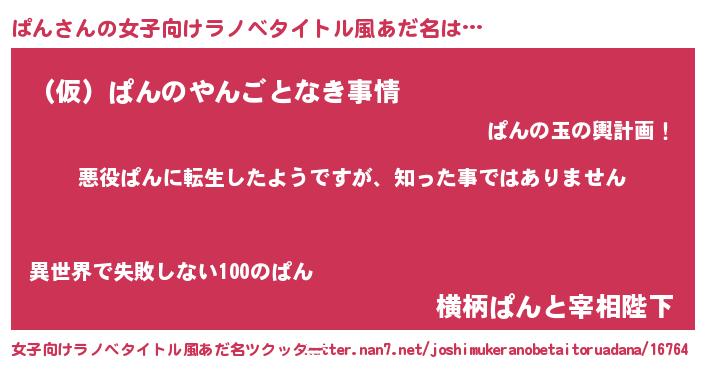 | 男性向けラノベタイトル風あだ名 | 『この素晴らしい世界にぱんを!』 |