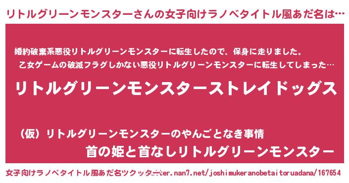 | 男性向けラノベタイトル風あだ名 | 『Re:リトルグリーンモンスターから始める異世界生活』 |