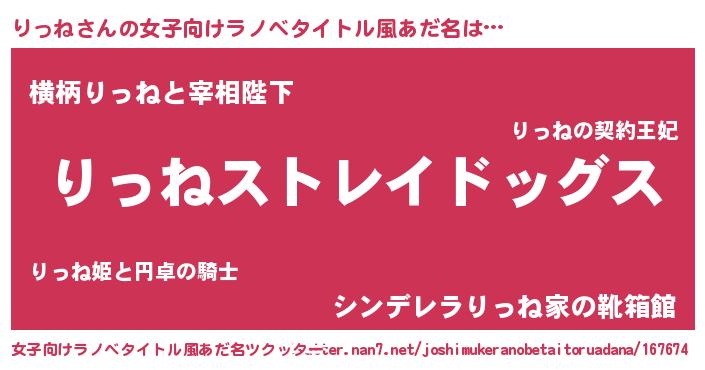 | 男性向けラノベタイトル風あだ名 | 『Re:りっねから始める異世界生活』 |