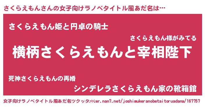 | 男性向けラノベタイトル風あだ名 | 『さくらえもんに滅ぼされるだけの簡単なお仕事です』 |