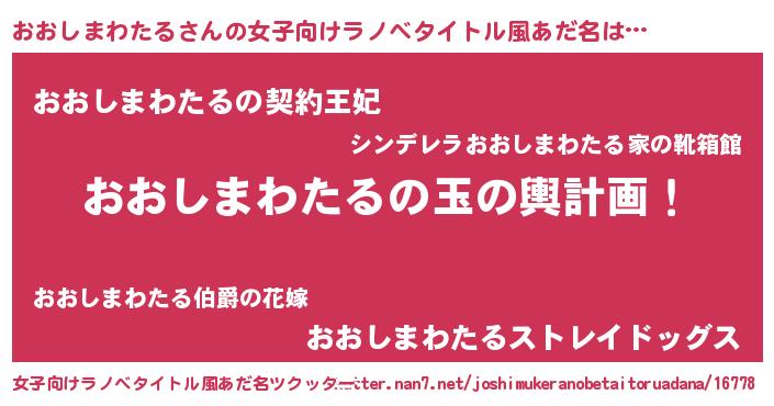 | 男性向けラノベタイトル風あだ名 | 『おおしまわたる~年齢イコール彼女いない歴の魔法使い~』 |