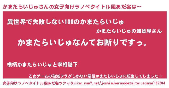 | 男性向けラノベタイトル風あだ名 | 『魔法科高校のかまたらいじゅ』 |