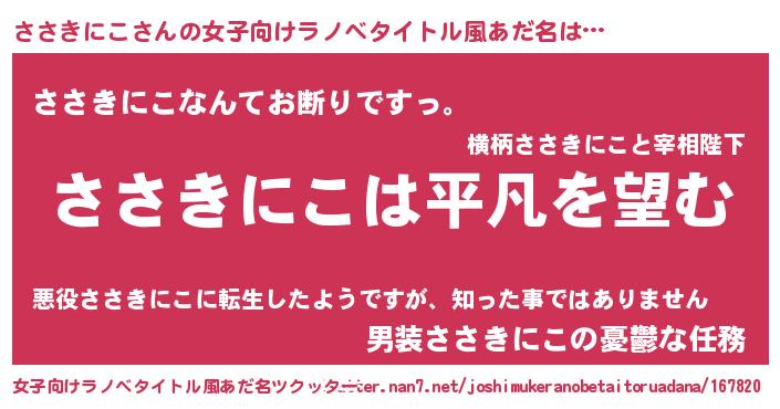| 男性向けラノベタイトル風あだ名 | 『ダンジョンにささきにこを求めるのは間違っているだろうか』 |