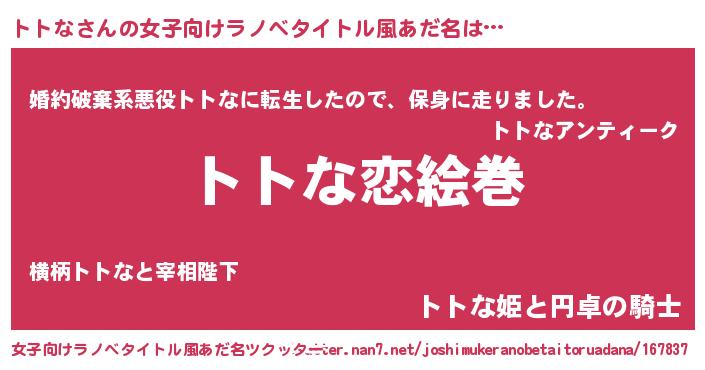 | 男性向けラノベタイトル風あだ名 | 『おまえをオタクにしてやるから、俺をトトなにしてくれ! 』 |