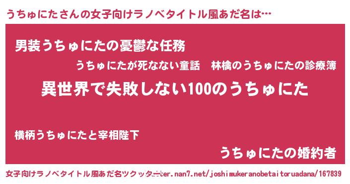 | 男性向けラノベタイトル風あだ名 | 『うちゅにたという概念が存在しない退屈な世界 』 |