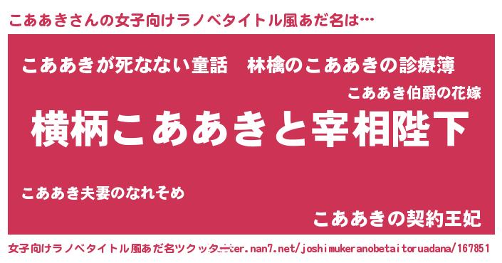 | 男性向けラノベタイトル風あだ名 | 『こああきに滅ぼされるだけの簡単なお仕事です』 |