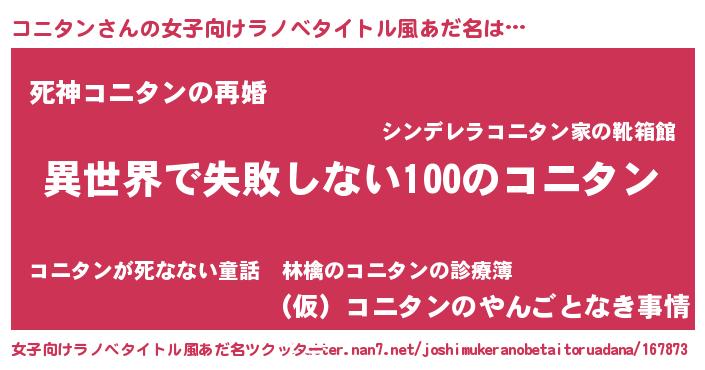 | 男性向けラノベタイトル風あだ名 | 『コニタンという概念が存在しない退屈な世界 』 |