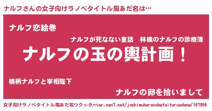 | 男性向けラノベタイトル風あだ名 | 『転生したらナルフだった件』 |